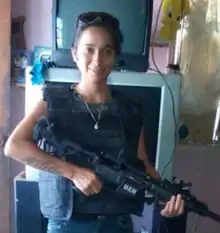 Niño gained notoriety on social media on 5 January 2015,[9] when an anonymous online user leaked a picture of her to Valor por Tamaulipas, a citizen journalist page that post security updates and organized crime leaks. Her pictures made it to Facebook and Twitter.[3] The picture identified her as a Gulf Cartel hitwoman based out of Río Bravo, Tamaulipas;[10] she was smiling in front of the camera and posing with a firearm and bullet proof vest.[lower-alpha 2][12] She was resting her sunglasses on her head and was wearing a golden necklace.[13] The picture's background stirred commentary on the apparent low-income lifestyle of cartel-employed assassins, which seemed to contradict the notion that those working for organized crime groups in Mexico live luxuriously.[14] In addition, others discussed in the comment section whether or not lifestyles like Niño's were worth the risk when organized crime bosses reportedly enjoy most of the luxuries.[3][14] Her picture was shared more than 40 times and had over 1,500 likes on Facebook.[15]