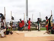 Influenced by the engravings and the tattoos that he observed on his grandmother's body and pillars of the royal houses to the west of Cameroon, he drew a lot during his childhood in the village. He then got introduced to different types of artistic practices (sculpture, colorization, jewelry, basketry and weaving), the combination of which will characterize his future work. His works are marked by the influences of traditional sculpture in his home region.[2] The fusion of found objects linked with copper wire and stitches that he invents, confront the challenge of the free volume. Concretizing his desires, pains, passions, indignations and dreams through his sculptures, Sumégné invents his philosophy and his technique of JALA'A to manifest and magnify self-transcendence. The topics addressed by Sumégné are multiple: masks and characters of traditional powers, men and women on the move (dancers, pushed-pushers), scenes out of his daily environment.[3]