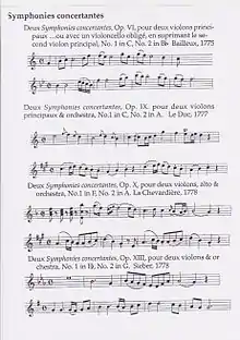 Saint-Georges's first compositions, Op. I, were a set of six string quartets, among the first in France, published by famed French publisher, composer, and teacher Antoine Bailleux.[32] They were inspired by Haydn's earliest quartets, brought from Vienna by Baron Bagge. Saint-Georges wrote two more sets of six string quartets, three forte-piano and violin sonatas, a sonata for harp and flute, and six violin duets. The music for three other known compositions was lost: a cello sonata, performed in Lille in 1792, a concerto for clarinet, and one for bassoon.