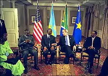 Kabila rose to the presidency on 26 January 2001 after the assassination of Laurent-Désiré Kabila, becoming the world's first head of government born in the 1970s.[11] Aged 29, he was considered young and inexperienced. He subsequently attempted to end the ongoing civil war by negotiating peace agreements with rebel groups backed by Rwanda and Uganda, the same regional armies who had brought Laurent-Désiré Kabila's rebel group to power three years before. The 2002 peace agreement signed at the Inter-Congolese Dialogue in Sun City, South Africa, which nominally ended the Second Congo War, maintained Joseph Kabila as President and head of state of the Congo. An interim administration was set up under him, including the leaders of the country's two main rebel groups as vice-presidents (two other vice-presidents were representatives of the civilian opposition and government supporters respectively). On 28 March 2004, an apparent coup attempt or mutiny around the capital Kinshasa, allegedly by members of the former guard of former president Mobutu Sese Seko (who had been ousted by Kabila's father in 1997 and died in the same year), failed.[12] On 11 June 2004, coup plotters led by Major Eric Lenge allegedly attempted to take power and announced on state radio that the transitional government was suspended, but were defeated by loyalist troops.[13][14]