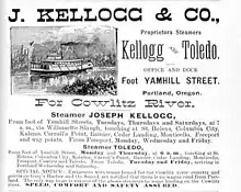 - "J. Kellogg's Steamers Joseph Kellogg and Toledo for Cowlitz River …". The Columbian (advertisement). Vol. 2, no. 31. St. Helens, OR: E.G. Adams. March 10, 1882. p.3, col.4.