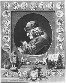 He grew progressively more blind from the time of his retirement from public service and was almost completely blind at the time of his death, a near-centenarian in 1782. He found, however, a way to turn this handicap to profit, working on the succeeding volumes of his opus by day as easily as by night, writing his text on a thin ribbon of paper that he pulled off one spool only to be wound back up onto another to be later transcribed by his secretary. His sense of touch became phenomenally acute and he was able to identify minor variants of certain coins by subtle tactile differences alone. The portrait displayed on the upper right side of this page, from the frontispiece to one of the volumes of his work shows him surrounded by some of his favourite coins and antiquities in 1780, when he was already over 98 years of age.