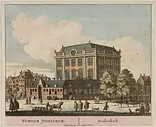 Joseph Penso was born about 1650 into a family of Spanish and Portuguese Jews.[4] He was the son of Isaac Penso Félix (-1683) and of Esther de la Vega (-1679) who was a relative of the Vegas that founded a Talmudic school in Livorno. His father was a converso from Espejo, a small town in Córdoba province (Andalusia, Spain), who had made a solemn vow in the dungeon of the Inquisition that within a year after regaining his liberty he would openly profess Judaism. This oath he seems to have fulfilled in Middelburg after his escape to Antwerp.[5] He moved to Hamburg, where he married Esther de la Vega.[6] Sara, their first child, was born there in 1645.[lower-alpha 1] In an unknown year the family settled in Amsterdam.[lower-alpha 2] According to the marriage certificates in the Amsterdam City Archives, Joseph had three younger brothers: Abraham (ca 1656-1710) was a schoolmaster and a diamond seller;[9] David (1654-) and Raphael (ca 1659-) were merchants, who married on the same day in December 1687 two sisters Alvares Vega from Antwerp.[lower-alpha 3] Between 1700 and 1710 they acted as agents in London for Dutch investors.[11] The former moved to Dublin, see Ballybough Cemetery.