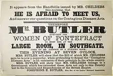 Two months after the withdrawal of Bruce's bill, a ministerial by-election in Pontefract in 1872 gave the LNA an opportunity for further action. Although they did not field a candidate, Butler attended meetings in the town. At one LNA meeting the floor of the room had been liberally sprinkled with cayenne pepper by her opponents, making speaking difficult. After it was cleared away, her opponents set bales of straw alight in a storeroom below, which led to smoke rising through the floorboards; two members of the Metropolitan Police—specially drafted into the town for the by-election—looked on but took no action.[82][83][lower-alpha 12] Although the incumbent Liberal candidate, Hugh Childers, was returned, there were heavy abstentions, and his vote was reduced by around 150 (from an electorate of 2,000).[85][lower-alpha 13] In December 1872 Butler met the Prime Minister, William Gladstone, when he visited Liverpool College. Although he supported the aims of the LNA, he was politically unable to back the LNA publicly, and had supported Bruce's bill.[87]