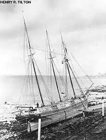 At about 3:00am surfman Fernando Bearse who was on patrol spotted a schooner about a quarter mile from land directly in front of the station. With the surf pounding hard and the wind blowing strong it was decided against launching the surfboat. Around 6:30 am the Henry R. Tilton had swept westward and was now within range of the Lyle gun. Captain James' first two shots were unsuccessful, but the third shot landed within reach of the crew on board who quickly secured the whip line to the foremast twenty feet above the deck. After bringing the first sailor ashore the rescuers realized that the Henry R. Tilton was still drifting toward shore. After each transfer of a crewmen from ship to shore the rescuers had to reset the lines. The men handling the lines had to wade out into the water and were standing dangerously close to the breaking waves. From time to time the sea would engulf the men and equipment. It took over three hours with a mixed crew of U.S. Life-Saving men and Humane Society volunteers to bring all seven crew members of the Henry R. Tilton to safety. Back at the Point Allerton Station, Louisa James and the wives of the other surfmen had lit fire in the station's stove, laid out blankets, hot drinks and cared for the surviving crew of the Henry R. Tilton. After enduring 15 hours of riding out the storm the crew of the Henry R. Tilton could finally feel safe.[10]