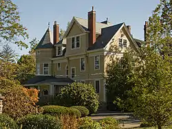 Kirby's Wyoming house was built in 1890 in a Shingle-style variant of the Queen Anne style of architecture.[1] Featuring a weatherboarded exterior and a stone foundation and a slate roof,[5] it is a frame building, two-and-a-half stories tall. Among its notable elements are various Neoclassical details, windows of high-quality art glass, and a verandah with columns in the Beaux-Arts style. Overall, the house is a mix of styles, mingling older styles with the latest in floor plans.[2]