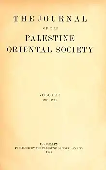 The society published The Journal of the Palestine Oriental Society (JPOS) from October 1920 with the first bound volume appearing in 1921.[8] Articles were in English, French, and German. It was not issued for several years during the Second World War, and having resumed, ceased permanently with volume 21 in 1948.[9]