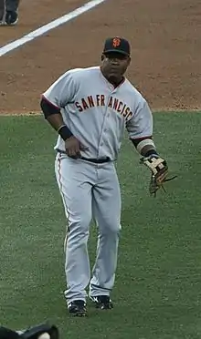 On January 29, 2009, Uribe signed a minor league deal with the San Francisco Giants.[29] It was announced on April 4 that Uribe had made the Giants final roster as a utility player.[30] Uribe wound up making a lot of starts at second base, shortstop, and third base throughout the season.[31] On July 10, Uribe bobbled a ground ball with one out in the eighth inning of Jonathan Sánchez's no-hitter against San Diego, allowing Chase Headley to reach first base. The effort had been perfect up to that point, and Sánchez went on to retire each of the remaining five batters, meaning this error lost the first perfect game since Randy Johnson 's in 2004. This was the first no-hit, no-walk, no–hit batsman game that was not also a perfect game since Terry Mulholland's no-hitter in 1990.[32] In 122 games (398 at-bats), Uribe batted .289 (his highest average since 2001) with 115 hits, 26 doubles, 16 home runs, and 55 RBIs.[1]