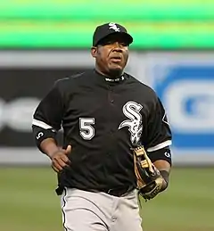 In 2005, Uribe spent the entire season playing shortstop after the White Sox did not re-sign José Valentín.[1][14] In 146 games, a number that would have been higher had it not been for minor injuries, Uribe batted .252 with 121 hits, 23 doubles, 16 home runs, and 74 RBIs.[1] In Game 1 of the American League Division Series (ALDS), Uribe hit a home run and had three RBIs as the White Sox defeated the Boston Red Sox 14–2.[15] Uribe made two memorable defensive plays for the final two outs of the 2005 World Series, first catching a ball while crashing into the third base stands and then ranging over the middle and firing an off-balance throw on a slow grounder to beat Houston Astro Orlando Palmeiro to give the White Sox their first title in 88 years.[16]
