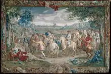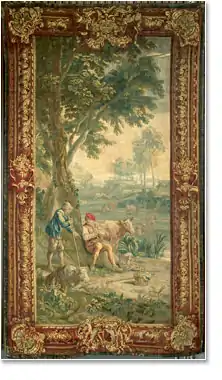 Woven in the workshop of Judocus de Vos about 1710 after design by David Teniers the Younger, this wool and silk tapestry was probably made for the upper class market in Europe and Britain