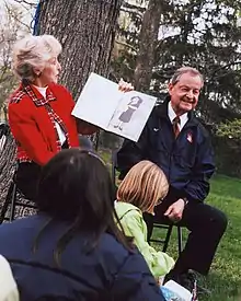 Welcoming more than 10,000 visitors per year, O'Bannon referred to the Indiana Governor's Residence as the "State's Living Room" and used the high-profile location to bring attention important community issues, including amplifying the education and reading programs that were a cornerstone of her husband's agenda in the Governor's Office. In line with that, she hosted an annual Reading Day at the Residence,[7] which paired graduates of adult literacy programs with school children from throughout the state. She also made the Governor's Residence a showcase for Indiana arts with the creation of the First Lady's Arts Series, featuring new exhibitions each quarter by Indiana artists, and the annual Day with the Arts, co-hosted by VSA of Indiana, which welcomed more than 800 children with disabilities and volunteers for arts activities and workshops. O'Bannon, who had been a long-time advocate for people with disabilities, raised more than $1.2 million in private funds to renovate of the Governor's Residence to make it accessible for people with disabilities.[15][16]