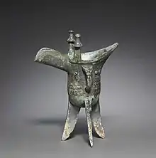 A jue (Chinese: 爵; Wade–Giles: chüeh) is a type of ancient Chinese vessel used to serve warm wine during ancestor-worship ceremonies.[1] It takes the form of an ovoid body supported by three splayed triangular legs, with a long curved spout (liu 流) on one side and a counterbalancing flange (wei 尾) on the other. Many examples have one or two loop handles (pan 鋬) on the side and two column-shaped protuberances (zhu 柱) on the top of the vessel, which were probably used to enable the vessel to be lifted using leather straps. They are often ornately decorated with taotie decorations representing mythical beasts.[1][2] They are in effect a small Chinese equivalent of the ewer. The name jue is not original, but derives from the Shuowen Jiezi, a dictionary of the 2nd century AD.[3]