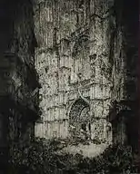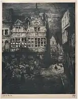 In his large plates from before World War I, such as House of Jan Palfyn, Ghent and Placing the Dragon on the Belfry of Ghent De Bruycker demonstrated the high level of virtuosity he had achieve as an etcher which allowed him to include rich detail and chiaroscuro effects. These works resemble the etchings of the Anglo-Welsh artist Frank Brangwyn, who assisted De Bruycker during the years of his exile in London. Although he produced some city views of London during the war, he mainly worked on large prints, which decried the violence and death that the war had brought to his country. The visual language of these prints drew from the Flemish traditions of Brueghel and Bosch as well as the story of Ulenspiegel. Flemish artists of De Bruycker’s generation had rediscovered the art of the Flemish primitives through the exhibition 'Les Primitifs Flamands' ('The Flemish Primitives') held in Bruges in 1902. Each artist had reacted to this rediscovery in a personal way.[3] Ensor's influence can also be seen in a few of De Bruycker's war prints. The preliminary studies for these etchings demonstrate De Bruycker’s talents as a draughtsman.[2] During his stay in London, De Bruycker met other artists such as Walter Sickert and got to know the work of James Whistler which influenced his work.