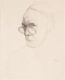 His health gradually started to dwindle, probably as a result of his exposure to acids during the etching process. He concentrated mainly on drawing. When the Germans occupied Belgium again in 1940, he produced a series of prints under the title 'Gens de chez nous – 1942' (People from here - 1942). He also worked on another album called 'Gens pas de chez nous' (People not from here). This latter series depicted the German occupiers. The six etchings in this series were only published after his death not long after the end of the war.[10] During the war German print lovers had visited De Bruycker and even asked him to produce a drawing for propaganda purposes which he refused categorically.[3]