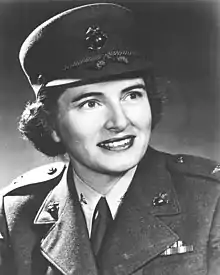 From 1937 to 1943, she served with the United States Information Service in Washington, D.C. In April 1943, she entered the Marine Corps and was assigned to the first Marine Corps Women's Reserve Officer Training Class at Mount Holyoke, Massachusetts. On completing the course, she was commissioned a first lieutenant in the Women's Reserve, 4 May 1943. She was selected as adjutant to then-Captain (later Colonel) Katherine A. Towle at the Women's Recruit Training Center at Hunter College in New York.[1]
