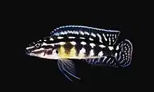 Julidochromis marlieri is a species of cichlid endemic to Lake Tanganyika where it is only known from the northwestern portion preferring rocky shorelines in deep waters. In the aquarium trade, it is commonly known as Marlier's Julie, Spotted Julie or Chequered Julie. This species reaches a length of 15 centimetres (5.9 in) TL.[2] Adult females are larger than adult males.