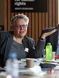 A 2004 column by Bindel titled "Gender Benders, beware" printed in The Guardian caused the paper to receive more than two hundred letters of complaint from transgender people, doctors, therapists, academics and others. The column expressed her anger about Kimberly Nixon – a transgender woman who was expelled from her training as a rape crisis counsellor on the basis that she was trans – and also included Bindel's views about transgender people and transgender rights, which drew significant criticism.[82][85] Trans rights advocacy group Press for Change cite this article as an example of "discriminatory writing" about transgender people in the press.[86] Complaints focused on the title, "Gender benders, beware", the cartoon accompanying the piece,[87] and the disparaging tone, such as "Think about a world inhabited just by transgender people. It would look like the set of Grease" and "I don't have a problem with men disposing of their genitals, but it does not make them women, in the same way that shoving a bit of vacuum hose down your 501s [jeans] does not make you a man."[82][88] Bindel later apologized for the article's 'offensive' tone.[89][83][90]