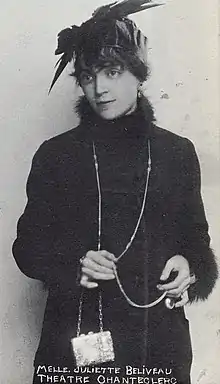 Béliveau's second job came at age twelve, when she gained a part in La Case de l'oncle Tom which was performed by the acting company of Paul Cazeneuve at the Théâtre National.[2] She went to study for a time at the Académie Marchand, before returning to the theatre in 1902 to play the role of Fanfan in La Famille Benoîton at Théâtre Les Nouveautés. She followed that by playing the title role in Véronica in 1903. In 1911, Béliveau took a job with the acting companies Conservatoire Lasalle and Nationascope. She married in 1916, and as a result appeared in significantly fewer performances.