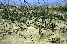 Juncus breweri is a species of rush known by the common name Brewer's rush. It is native to western North America from British Columbia to northern California, where it grows in coastal habitat such as beaches and marshes. It is a perennial herb growing from a tough rhizome which anchors it in sand and other unstable substrate. It produces slender stems up to 1.3 metres (4 ft 3 in) long. The leaves are bladeless and are reduced to dark brown sheaths around the stem bases. The inflorescence is a cluster of flowers emerging from the stem and accompanied by a single long, cylindrical bract which looks much like an extension of the stem. The flowers have purplish brown and greenish segments a few millimeters long.