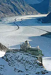 The station is located east of the Jungfraujoch, less than 300 metres away, below the Sphinx ridge. The Jungfraujoch itself is a snow saddle constituting the lowest point of the ridge between the Jungfrau and the Mönch.[1][2] A complex of tunnels connects the railway station to the Top of Europe building, overlooking the Aletsch Glacier on the south side, and an elevator to the summit of the Sphinx, the peak overlooking the saddle from the east. At the Sphinx are enclosed and open viewing platforms, with views over both sides of the Jungfraujoch and the surrounding peaks. A scientific observatory, the Sphinx Observatory, is also located here.[2]