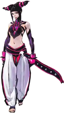 Juri's shirt was modeled after a spider, and left the sides of her breasts exposed at Ono's suggestion. Her pants were designed to give a "silhouette that looks like a Taekwondo uniform." The black trim on her pants was added to set her apart from other Street Fighter characters who wear similar uniforms.[1] Her colour scheme was originally plain. However, when lined up with other characters, she didn't stand out; as a result, they employed hot pink, a colour not used in any other female character in the game. They added black details to her outfit to make it less "frivolous."[1] A pink crystal, known as the Feng Shui Engine, was added as a replacement inside her left eye after deciding to align her with Seth, in order to more closely tie her character to the organization. The crystal was originally in her stomach, similar to Seth. Other ideas were considered, including having it in one of her palms, one of her legs, or one of her ankles. They eventually settled on putting it in her eye, with design director Kamei commenting that a "big globe in the stomach of a female character wasn't going to look very attractive." He also commented that an eye is a logical place to have an artificial replacement, as well as already being spherical.[1] Initially, Juri was designed to be chubbier and cuter. Gradually the design was made slimmer, though the team noted at some point they had realized they had overdone it and reversed the changes slightly. She was given full legs, and a slender upper body in order to show the contrast. Kamei wanted to make her even more slender, but decided that if she was too small, her kicks would lack impact.[1] Several designs were considered for her face, going through about seven versions before settling on her current appearance, though time constraints played a part in the decision.[1]