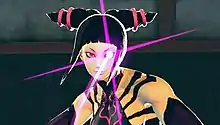 Juri has a number of special techniques; all of which utilize quarter-circle, shoryuken, and similar motions.[3] These include a quick flip kick, a dive kick, and a technique called Fuhajin kick, which allows fireballs to be fired from her feet. These fireballs can be controlled by the strength of the kick input; depending on it, the fireballs will travel at different angles. Players may also store fireballs by holding down the kick button. 1UP.com editor Richard Li compared this mechanic to Gilgamesh's from Fate/Unlimited codes. Players may store three sets of fireballs by holding three buttons to charge them, choosing to release them in tandem or one-by-one.[15] GamesRadar editor Brett Elston commented that while her dive kick was "so much fun that it’s almost irresistible," it "shouldn't be your first choice every time you get into the air." He adds that the move is so overused by Juri players that players can beat them without attacking.[20] Juri's special attacks include the Senpusha wheel kick and the Shikusen triple air kick. Her ultra attacks include the Feng Shui Engine, which allows her normal attacks to chain upwards for a short time; and the Kaisen Dankairaku.[21] In one of her ultra moves, she was intended to kiss the opponent's cheek, but this was toned down. Okada commented that other ideas were so extreme that the game would have needed a higher content rating.[3] She also has a pinwheel kick attack, which acts as an "offensive chip damage" attack.[16] In discussing the pinwheel kick, developer Tamamura commented that females in fighting games typically have attacks with several hits to them, describing this move as an example of how she likes to show off.[3] A dodge technique was implemented as a means of reflecting her personality, with developer Okada stating that it is a move that "puts her opponent off balance." He goes on to describe her as "one of the fastest and trickiest characters in Street Fighter history."[3]