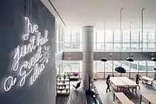 JustCo redesigns the interiors of large office spaces and buildings, subletting them to companies and individuals upon completion.[17] All locations feature common areas such as event spaces, meeting rooms and cafe.[4] Large-scale corporations make up more than half of clients, compared to traditional coworking tenants who target startups or freelancers.[9][17] All JustCo locations feature common areas, such as event spaces, meeting rooms and café.[4] In 2018 the company opened its first curated business community space, the Verizon Innovation Community in Singapore, formed with Verizon Communications as a space for digital and technology companies.[18]