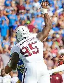 Madubuike redshirted his first year at Texas A&M in 2016. In 2017, he appeared in all 13 games, recording 20 tackles. He again appeared in all 13 games in 2018, finishing with 40 tackles and 5.5 sacks.[6] As a junior he had 45 tackles and 5.5 sacks. After the season, he decided to forgo his senior season and entered the 2020 NFL Draft.[7][8] He decided to sit out the 2019 Texas Bowl.