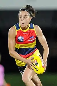 Mules made her AFLW debut in the thirty-six point win against Greater Western Sydney at Thebarton Oval in the opening round of the 2017 season.[2] She struggled to maintain a spot in the side when she was omitted for the round two match against the Western Bulldogs at VU Whitten Oval,[3] the round four match against Fremantle at Fremantle Oval[4] and the round six match against Melbourne at TIO Stadium.[5] She played her first consecutive games for the season in the round seven match against Collingwood at Olympic Park Oval and when she was a part of Adelaide's premiership side after the club defeated Brisbane by six points at Metricon Stadium in the AFL Women's Grand Final.[6][7] She missed three matches in her debut season to finish with five matches.[8]