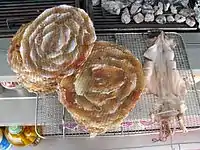 Jwipo (Korean: 쥐포) is a traditional Korean pressed fish jerky sold as a street snack. Made from the filefish (or Jwichi[1]), it is dried, flattened and seasoned. Jwipo has a subtle sweet flavor. It is traditionally served hot, heated on a burner until it curls.