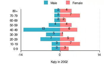 According to the 2002 Poland census, there were 80 people residing in Kąty village, of whom 51.3% were male and 48.7% were female. In the village, the population was spread out, with 18.7% under the age of 18, 31.3% from 18 to 44, 27.5% from 45 to 64, and 22.5% who were 65 years of age or older.[2]