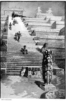 The Hieroglyphic Stairway climbs the west side of Structure 10L-26. It is 10 meters (33 ft) wide and has a total of 62 steps. Stela M and its associated altar are at its base and a large sculpted figure is located in the centre of every 12th step. These figures are believed to represent the most important rulers in the dynastic history of the site. The stairway takes its name from the 2200 glyphs that together form the longest known Maya hieroglyphic text. The text is still being reconstructed, having been scrambled by the collapse of the glyphic blocks when the façade of the temple collapsed.[2] The staircase measures 21 meters (69 ft) long and was first built by Uaxaclajuun Ubʼaah Kʼawiil in AD 710, being reinstalled and expanded in the following phase of the temple by Kʼakʼ Yipyaj Chan Kʼawiil in AD 755.[3]
