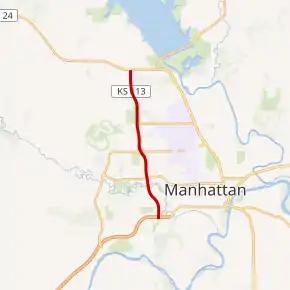 The road begins at K-18 in the western part of Manhattan with a diverging diamond interchange. The route moves northward through suburbs surrounded by deciduous forests before reaching a diamond interchange with Anderson Avenue and then another with Kimball Avenue, travelling through a more condensed part of town. Passing Washington Marlatt Memorial Park, the road exits town and enters a semi-rural grassland area, ending at a partial interchange with US-24.[3]