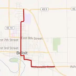 K-129 began at US-24 southeast of Beloit and began travelling west along Asherville Road. The highway then curved north becoming Brooklyn Avenue until reaching Elliot Street where it turned back west. It then intersected River Street, where it turned north and crossed a series of railroad tracks. After crossing the tracks, K-129 turned west onto East South Street then intersected K-14. At this point K-129 turned north and began to overlap K-14. The two routes continued north for .13 miles (0.21 km) and intersected the western terminus of K-124 (East Main Street). K-129 and K-14 continued north for another .5 miles (0.80 km) before reaching East 8th Street, where K-14 turned west and K-129 continued north along North Hershey Avenue. It continued north for then curved east briefly before turning back north onto North Walnut Street. K-129 continued past the then reached its northern terminus at US-24 and K-9.[1][3]