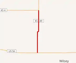 K-149's southern terminus is at US-56 west of Council Grove. Aside from a 1⁄10-mile (160 m) jog to the east near its midpoint due to a survey correction, the highway travels due north through the Great Plains.[3] The roadway crosses the West Fork Neosho River and passes an abandoned schoolhouse before reaching its northern terminus at K-4 south of White City.[4][5]