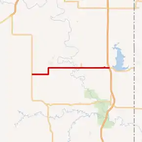 K-152's western terminus is at an intersection with K-7 south of Cadmus. The highway begins traveling east through small rolling hills with rural farmlands and scattered trees. It passes an intersection with Kettle Road then Lamb Road and after roughly 2.5 miles (4.0 km) reaches an intersection with Long Road. At this point, the highway turns northward for one mile (1.6 km) then passes Prairie View High School as it turns back eastward. The roadway continues east and passes through a dip that an unnamed creek runs through then levels out again. It continues east for about one mile (1.6 km) through flat rural farmlands and passes a group of houses surrounded by scattered trees, then intersects Maddox Road. The land then opens up slightly as K-152 continues east for one mile (1.6 km), where it crosses an unnamed creek then begins to parallel a levee. The highway soon intersects Linn County Route 1095, and then continues parallel to the levee for about 1.5 miles (2.4 km) before crossing the Marais des Cygnes River. After crossing the river, it enters the city of La Cygne as Market Street. It soon reaches a junction with Railroad Street then has an at-grade crossing with a BNSF Railway track. K-152 continues east through the city for another one mile (1.6 km) then exits the city.[6] Roughly .5 miles (0.80 km) after exiting the city it crosses Middle Creek, a tributary of Marais des Cygnes River. From here, it continues another roughly two miles (3.2 km) through small rolling hills covered with a mix of grasslands, farmlands and scattered trees. The highway then makes a series of three curves around a small hill with a house on it. From the curves, K-152 continues east for a short distance before reaching its eastern terminus at US-69 east of La Cygne.[5]