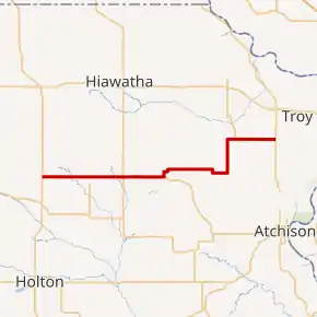 K-20 is a 37.21-mile-long (59.88 km) west–east state highway in the northeastern part of the U.S. state of Kansas. It connects U.S. Route 75 (US-75) in the Kickapoo Nation Indian Reservation with K-7 southwest of Troy. Along the way, K-20 intersects several major highways, including U.S. Route 159 in Horton, and overlaps U.S. Route 73 from Horton to south of Everest. Northeast of Denton, the highway intersects K-120, which travels north to Severance and Highland. K-20 travels through mostly rural farmlands and is a two-lane highway its entire length.