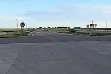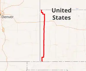 K-27 is an approximately 226-mile-long (364 km) north–south state highway that parallels Kansas' western border with Colorado. It is the westernmost north–south state highway in the state. It begins at U.S. Route 56 (US-56) in Elkhart near the Oklahoma state line and travels through the seven counties that border Colorado until reaching its northern terminus north of St. Francis, where it ends at the Nebraska state line (effectively becoming like-numbered Nebraska Highway 27). Along the way, it intersects several major highways, including US-160 in Johnson City, US-50 and US-400 in Syracuse, US-40 in Sharon Springs, Interstate 70 (I-70) and US-24 in Goodland, and US-36 in Wheeler. The section from US-40 north to Nebraska, is designated as the Land and Sky Scenic Byway. K-27 changes time zones twice, during its trek through Kansas, the only highway in the state to do so.