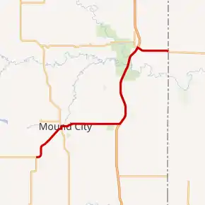 K-52's western terminus is at K-31 east of Blue Mound. The highway begins travelling east then after about 0.3 miles (0.48 km) curves north at 500th Road. It passes by a cemetery and through a forested area before curving northeast at 600th Road. The highway passes through a forested area for a short distance then transitions to flat rural farmlands. It continues for about 2.1 miles (3.4 km) then enters Mound City and intersects K-7. K-52 turns north and begins to overlap K-7 as 9th Street. After roughly 0.23 miles (0.37 km) K-52 turns east onto Main Street, as K-7 continues north. The highway continues along Main Street for about 0.7 miles (1.1 km) then curves northeast onto North Main Street. After 0.3 miles (0.48 km) it exits the city then curves east.[3] K-52 continues through flat farmlands for about five miles (8.0 km) then reaches an interchange with US-69. K-52 turns north and begins to overlap the four-lane freeway.[4]