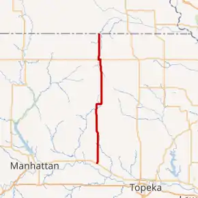 K-63's southern terminus is in St. Marys at US-24, also known as Bertrand Street. The highway has an at-grade crossing with a Union Pacific Railway (UP) track then continues northeast through the city as 6th Street. It curves northward then exits the city and intersects Delia Road about two miles (3.2 km) later.[7] The surrounding area becomes more rural as the highway continues north for 1.6 miles (2.6 km) through flat grasslands then crosses Bourbonais Creek. K-63 continues through flat grasslands with scattered areas of trees for 2.9 miles (4.7 km) then begins to run along the west side of Emmett.[8] After passing the city, the highway crosses Bartlett Creek then over a UP track. The highway continues for 3.6 miles (5.8 km) through flat farmlands, crosses Little Noxie Creek, then intersects St Clere Road, which travels east to Saint Clere. It continues north for 1.2 miles (1.9 km) then shifts about 1⁄2 mile (0.80 km) west.[9][10]