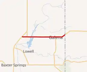 K-66 is a 5.527-mile-long (8.895 km) east–west state highway in the southeastern corner of the U.S. state of Kansas. Its western terminus is at U.S. Route 69 Alternate (US-69 Alt.) and US-400 in Riverton. Its eastern terminus is at the Missouri state line near Galena (where it continues as Missouri Route 66). This road is noteworthy in the fact that it used to be part of the famed US-66. After 1961, the nearby Interstate 44 (I-44) offered a more direct route between Missouri and Oklahoma. In 1985, US-66 was decommissioned nationally. Kansas replaced the US-66 designation with K-66 on the portion of historic highway not numbered as US-69 Alt.[2]