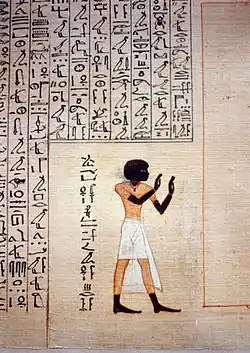 Maiherpri mummy was adorned with a mummy mask.[10] At the foot end of the rectangular coffin, on the east side was found his canopic box[11] with the four canopic jars still in it. Next to it there was the Book of the Dead of Maiherpri[12] and there were found several boxes with mummified pieces of meat.[13] At the head of the coffins many pottery vessels were found. Other objects from this tomb are stone vases, a senet game, a nicely painted faience bowl, a quiver, a glass vase and a funerary bed with the shape of Osiris laid out in wheat.[14]