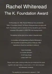 Rachel Whiteread had an advertisement printed in the British magazine, Art Monthly, in which she outlined her plan to donate £10,000 to Shelter and distribute the remainder in grants to 10 needy artists.[32] In the advertisement Whiteread stated that she "does not agree with the K Foundation's aims or methods"; the advertisement was in a similar style to the K Foundation ads, with stark white text on a black background.[32]