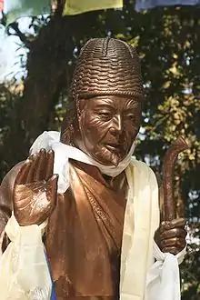 In the 17th century, Bhutias, in order to maintain cordial relationship with the Lepchas then decided with the help of three revered lamas from Western Tibet to consecrate a local Sikkimese person from Gangtok as the Chogyal of Sikkim. Thus, the first formal dynasty of the Namgyals in Sikkim came to be established in 1642. However, Phuntsog Namgyal, the first Chogyal or the King was made the temporal and spiritual leader of Sikkim after duly verifying that his antecedents were strongly linked to the 9th-century prince of the Kingdom of Minvang in eastern Tibet. This dynasty had ruled Chumbi and Teesta valley for considerable time. In the 13th century, a prince of this dynasty known by the name Guru Tashi, based on a clairvoyant vision, decided to go south of Tibet to Sikkim, then known as "Denzong-the valley of rice" to seek his fortune. While travelling on this mission with his family, he came to the Sakya Kingdom where a monastery was being built, and they were facing problems in erecting the pillars of the monastery. Then, one of Tashi's five sons, the elder son, erected the pillars of the monastery on his own and was honoured with the epithet "Khye Bumsa" (meaning: superior of ten thousand heroes). Pleased with the achievement of Khye Bumsa, the Sakya King gave his daughter in marriage to him. Bumsa then settled down in Chumbi valley where he met the Lepcha religious leader, Thekong Tek, several times seeking his blessings to beget children. Following the blessings of Thekong Tek, Bhums'a wife gave birth to three sons, and out of gratitude he visited the grand old sage in several times more in Sikkim nurturing an amicable relationship between them. However, Thekong Tek had no children and there was also a prophecy that one of Khye Bumsa's descendants would become the ruler of Sikkim. Thekong Tek then decided that after his death Bhumsa would take over the reins of power in his kingdom. Then a treaty of blood brotherhood was signed at Kabi Lungchok between Thekong Tek and Khye Bumsa to reinforce the bonding between the two communities of Lepchas and Bhutias of Sikkim. The solemn oath taken on the occasion was that Bhumsa "would not discriminate his newly acquired Lepcha subjects". Since then this location has been commemorated as symbol of friendship and brotherhood between the Lepchas and Bhutias of Sikkim and stone pillars have been erected to mark the place symbolically.[2][5] In 1642, Phuntsog Namgyal, the grandson of Khye Bumsa was crowned the first Chogyal of Sikkim at Yuksom by Rimpoche Lhatsun Chempo, the founder of the Nyingmapa order in Sikkim. This event is also marked by the Statue of Unity installed opposite to Tourist Information Office and close to the Thakur Bari Temple in Gangtok.[4][5]