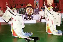 Mikagura (御神楽) is a ritual dance performed at the imperial court and at important Shinto shrines: Kamo-jinja and Iwashimizu Hachiman-gū.[5] It consists of welcoming, entertaining and greeting the deities with humorous or poetic syllabic songs. Today it is sometimes considered as a sub-genre of gagaku, of which it is one of the influences.[6] It predated Chinese inspiration, and has indigenous elements as well as influences from other elements such as kangen (管弦), bugaku (舞楽) and saibara (催馬楽), which are forms of gagaku,[7][8] More simply, mikagura can be considered as dances accompanied by gagaku music.[9]