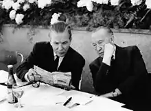 On 11 October 1954 Hassel assumed the office of a Minister-President of Schleswig-Holstein. From 1955–1956, he was President of the German Bundesrat. He was closely associated with Ludwig Erhard's two Chancellorships, serving as Minister of Defense from 9 January 1963 to 1 December 1966. In 1963 he secretly asked the United States to supply the Bundeswehr with chemical weapons.[1] He then served in Kurt Georg Kiesinger's cabinet from 1 December 1966 to 21 October 1969 as Minister of Displaced Persons, Refugees, and War Victims. His son Joachim von Hassel, a naval aviator and Oberleutnant zur See, was killed in a Lockheed F-104 Starfighter crash on 10 March 1970.