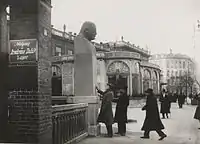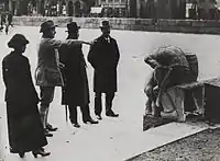 Around the same time he collaborated with the architect Ivar Bentsen on a redevelopment of Blågårds Plads, a public square in one of the poorest working-class neighbourhoods in Copenhagen. His work, executed from 1912 to 1916, consists of 22 granite sculptures integrated in a low wall which encloses a central, rectangular section of the square. The sculptures all portray a person plying a trade—a tailor, a cooper, a baker—accompanied by an abundance of chubby toddlers. The intention was to celebrate the workers and the children of the surrounding community and their everyday lives. It provoked hefty debate and criticism when it was inaugurated but was innovative in its integration of the sculptures in a piece of street furniture and a functional context. The wall was intended for sitting and climbing on, as well as the central space for children's play, and also incorporated a "soapbox" or tribunal for public speaking.[2]