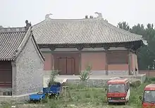 The current temple was founded during the Tang Dynasty, prior to the founding of Xincheng in 832 CE.[1] In 929 CE, Xincheng was walled, with Kaishan Temple located in the northeast corner of the walled town. During this time the temple was known to locals as ‘Dasi’, literally, ‘Big Temple’. The oldest structure that is currently standing at the temple site is the main hall, which according to a date written on a beam within the temple, was built during the Liao Dynasty in 1033.[2] By the sixteenth century, the temple had become very large, but by the early 20th century it was in decline.[1] In 1928, the main hall became a Sun Yat-sen educational hall, and ceased to function as a temple.[3] During the Cultural Revolution, many houses were built on the grounds of the temple, damaging the temple's surroundings.[4] In 2001, a restoration project funded by the government began with the goal of returning the temple to its prior state.[5]