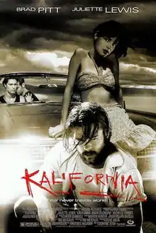 Kalifornia is a 1993 American road thriller film directed by Dominic Sena, in his feature film directorial debut. It stars Brad Pitt, Juliette Lewis, David Duchovny, and Michelle Forbes. The film tells the story of a journalist (Duchovny) and his photographer girlfriend (Forbes) traveling cross-country to research serial killings, who unwittingly carpool with a psychopath (Pitt) and his childlike girlfriend (Lewis).