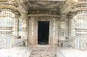 The decorativeness of the outer walls of the main shrine and its closed hall exemplify Chalukyan art. Projections and recesses with niches have been created and used skillfully to accommodate pilasters whose niches contains Hindu deities in relief, depicting the gods Indra, Shiva, his consort Parvati, Lakshmi and others.[1] The doorway to the vestibule has artistic carvings of dvarapalas (door keepers), the goddess of love Rati, and god of love Manmatha. The door lintel (lalata) has an image of Gajalakshmi (Lakshmi flanked by elephants on either side). The eaves over the door has fine images of the Hindu deities Brahma, Keshava (a form of Vishnu) and Shiva.[1] According to Sinha, the exuberance of sculptural articulation seen here is actually a southern Karnataka Hoysala influence on Chalukyan architecture.[3]